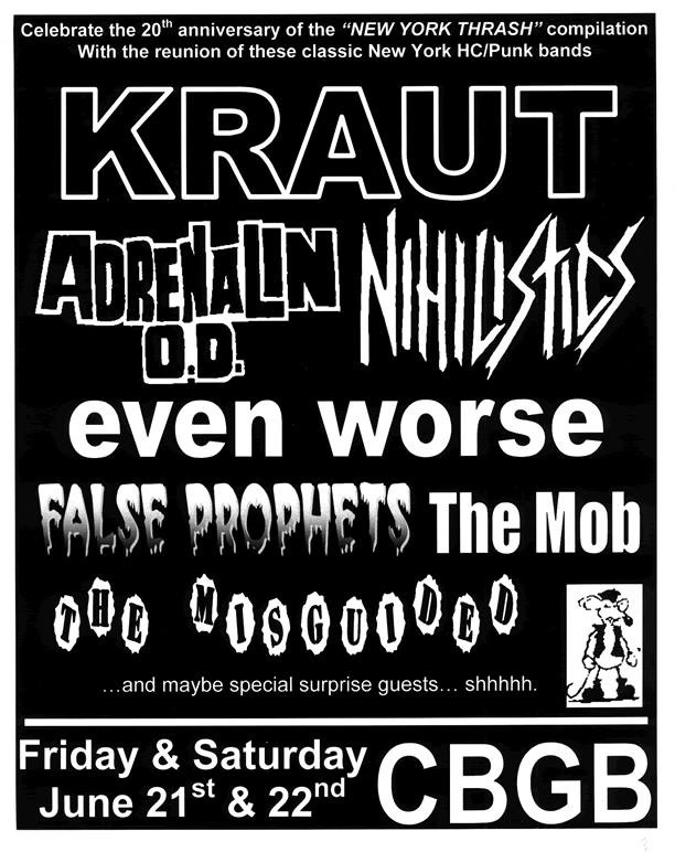 On March 14 I posted the only video of me on stage with the Nihilistics. Recorded at CBGB during the New York Thrash 20th Anniversary Reunion Fri., June 21, 2002 as I joined the then-current lineup for a few songs, it’s embarrassingly awful… but at least the audio is good. That’s because I recorded it myself via the CBGB board (AKA “mixer”) and into a Sony MiniDisc recorder I toted along. On the same MiniDisc I captured Adrenalin O.D.’s set and finally got around to mating my audio with the crappy video on YouTube. I offer the results here, as homage to one of my favorite hardcore bands as they head off to England for the first time ever.
