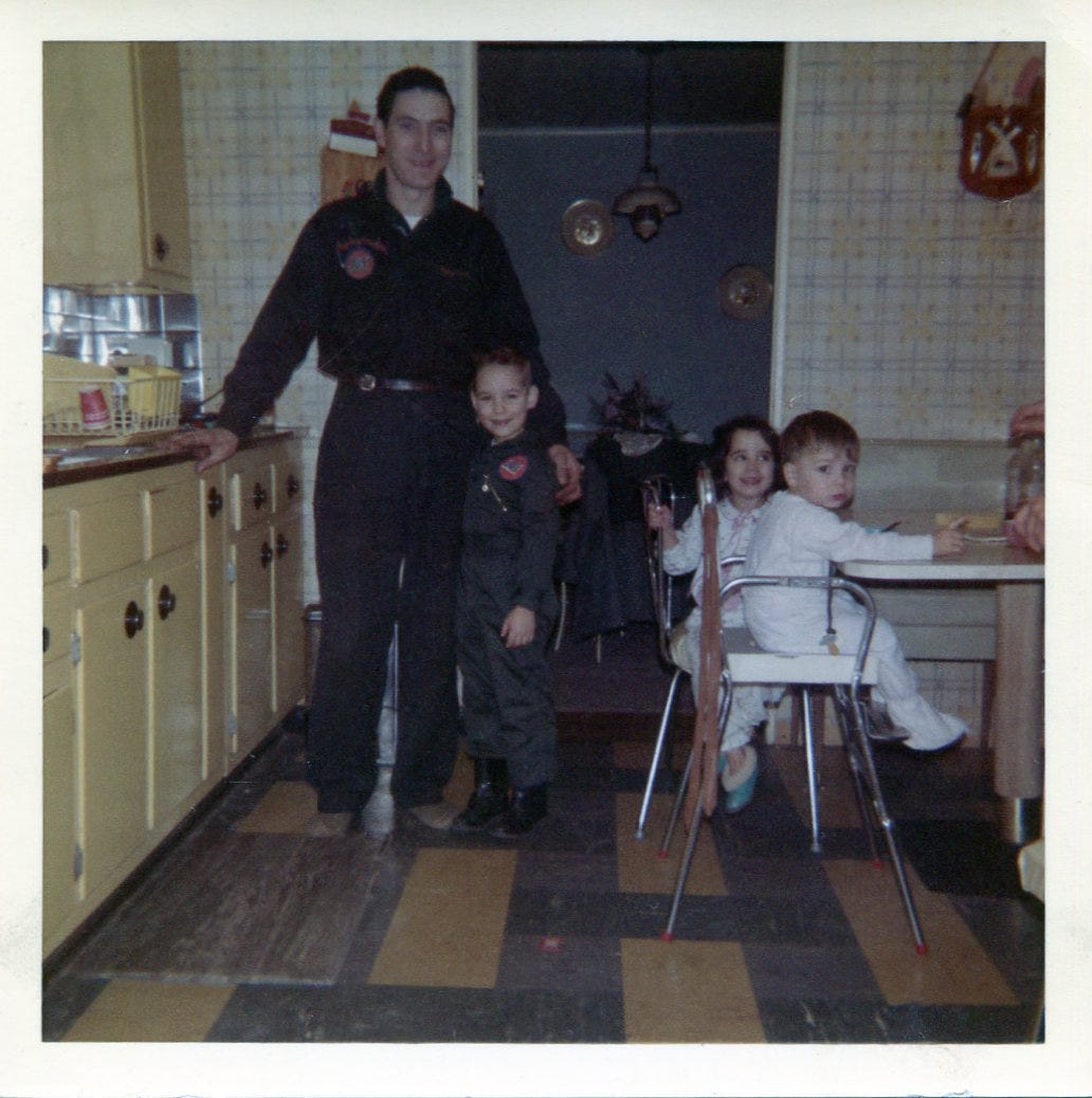 The early 1960s snapshot above has long fascinated me. Most likely taken by my mother Joan (RIP) with her trusty Kodak Brownie in our green and yellow kitchen at 680 South 5th in Lindenhurst, it shows my father Mario (RIP) and brother Mario Jr. (RIP) grinning in their matching navy blue Gulf coveralls, while my sister Joanie (RIP) and brother Marc look on. Whether the coveralls were store bought or sewn from a pattern by my mother or grandmother Evelyn (RIP) is lost to time. My father and Uncle Emil owned Trophy Motors on the border of Lindenhurst/West Babylon, a few yards north of the Long Island Railroad Babylon branch, pumping “That Good Gulf” gasoline and featuring two service bays. Mario repaired the vehicles, Emil ran the office, and Mario Jr. would sometimes tag along (my brother Marc and I were too young). I have no idea how much Trophy Motors pulled in but remember money always being tight around our house. Shopping at A & S or Woolworth’s or Billy Blake’s you’d grab something you thought you couldn’t live without, wave it in front of mom and hear some variation on…